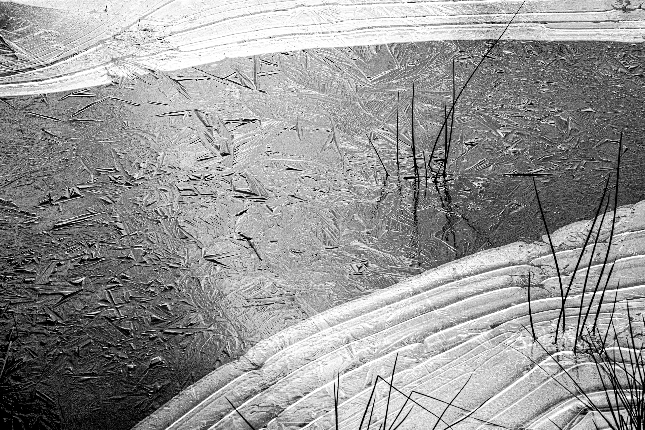 Frosten... forvandler flytende vann om til lysende speilbilder. Krakelerer tiden; fryser det skjøre øyeblikket. Livet stopper opp. Om enn så lenge......Inspirert av ART DECO. Vindenes, januar 2023